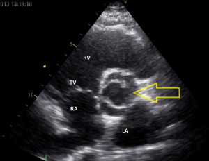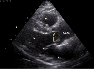 Op de korte as opname ziet u dat de aortaklep wel degelijk uit twee klepblaadjes bestaat. Het stilstaand plaatje tijdens systole doet denken aan een vissenbek. Er moet dus sprake zijn van een bicuspide aortaklep