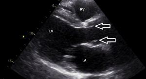 Een lange as opname laat een excentrische sluitlijn zien van de klep en een bolle “opgeblazen” configuratie van de kleppen tijdens systole (doming van de klepblaadjes).
