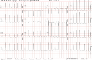 Op het elektrocardiogram ziet u een onregelmatig en snel ritme. Er is sprake van boezemfibrilleren met een ventrikelvolgfrequentie van ongeveer 100 tot 130/min. De stand van de elektrische hartas is normaal. Een QRS duur van 80 msec. Lichte downsloping ST-segment in afleidingen III en aVF. De voltages imponeren ruim op het oog maar de sokolow index voor linkerventrikelhypertrofie wordt net niet gehaald.