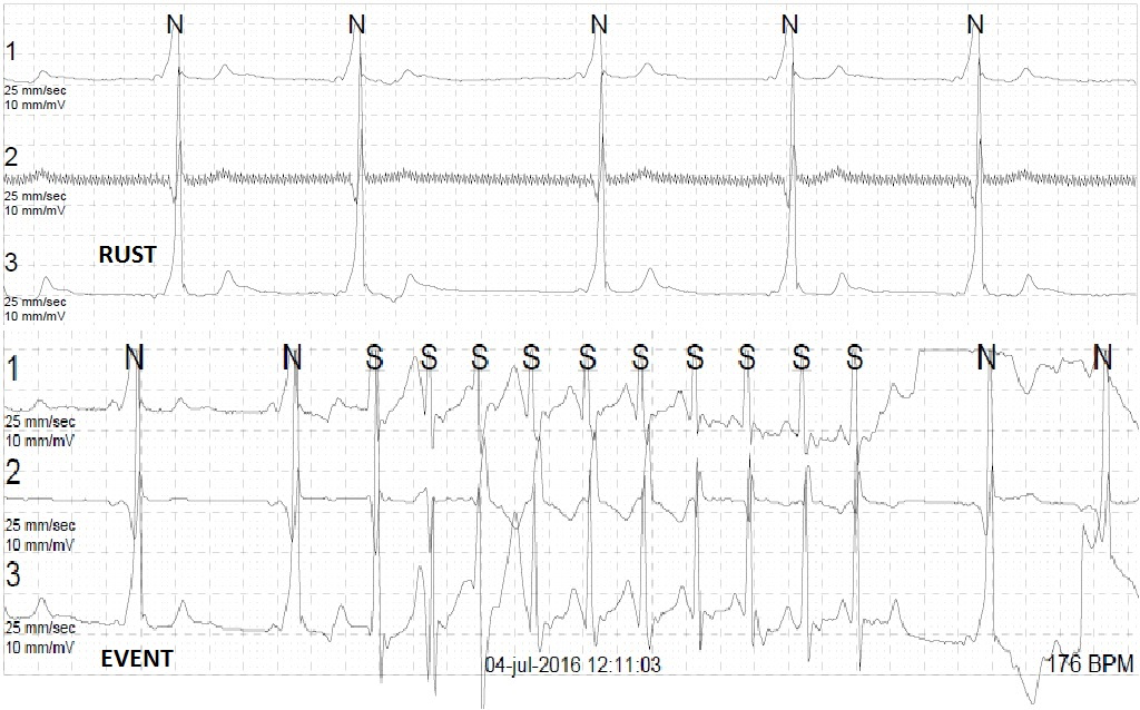 Figuur 2: Holterregistratie met paroxysmale regulaire smalcomplextachycardie 175/min verdacht voor een cirkeltachycardie