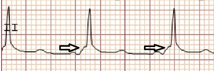Afleiding II uitvergroot met deltagolf: kenmerkend zijn een verkort PQ-interval (< 120 ms) en een iets verlengde duur van het QRS-complex (> 120ms). Elektrofysiologisch betekent dit een snelle atrioventriculaire geleiding (via de accessoire bundel) samen met een vertraagde geleiding in het ventriculaire myocard.