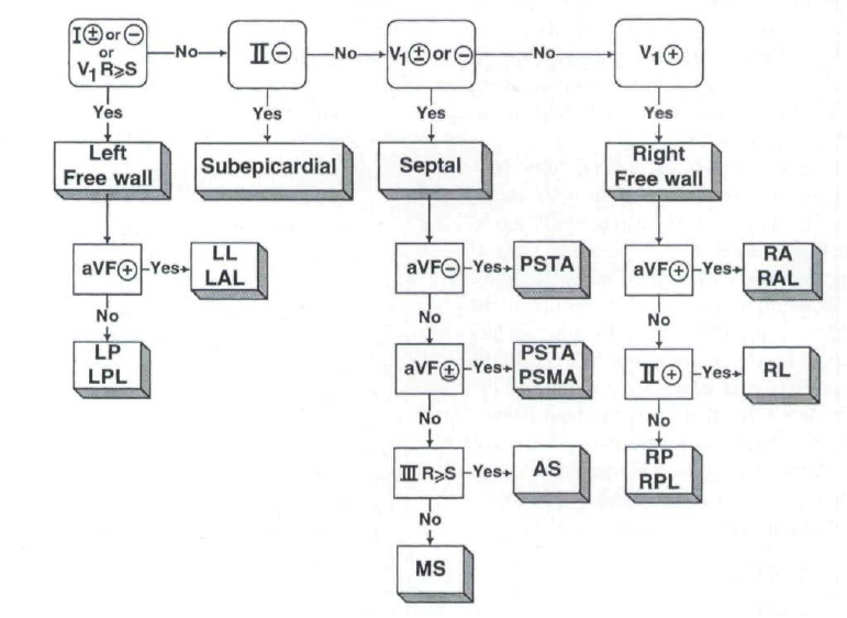 Bron literatuur Milstein criteria: Milstein et al. An algorithm for the electrocardiographic localization of accessory pathways in the Wolff-Parkinson-White syndrome. Pacing Clin Electrophysiol 1987;10:553-63