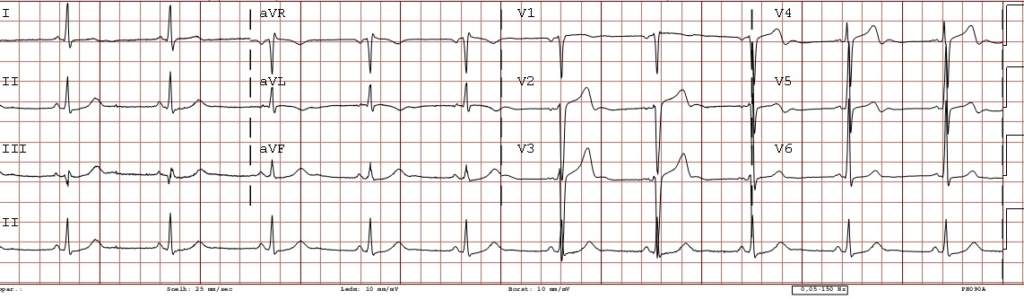 Een 44-jarige man met pijn op de borst. Wat ziet u op het elektrocardiogram?