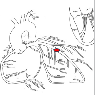 Figuur 3: Schematische weergave van de coronaire vaatboom. Met een rode stip is aangegeven waar de occlusie zich bevindt.