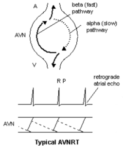 Figuur 3: typische AVNRT, antegrade geleiding via de slow pathway en retrograde geleiding via de fast pathway