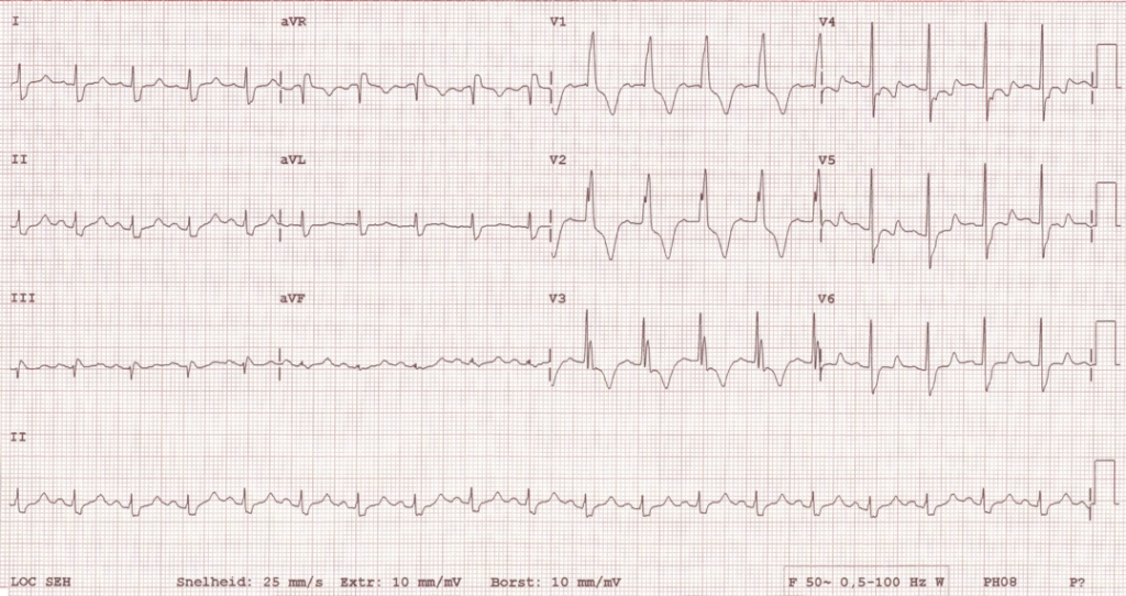 Een 55-jarige man met snel hartjagen. Wat ziet u op het elektrocardiogram?