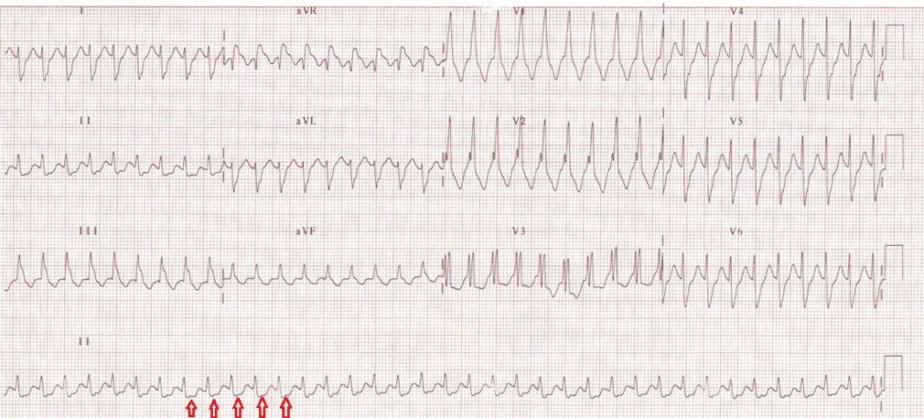 Figuur 4: met rode pijl aangegeven waar de p-toppen zich bevinden in het QRS complex