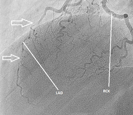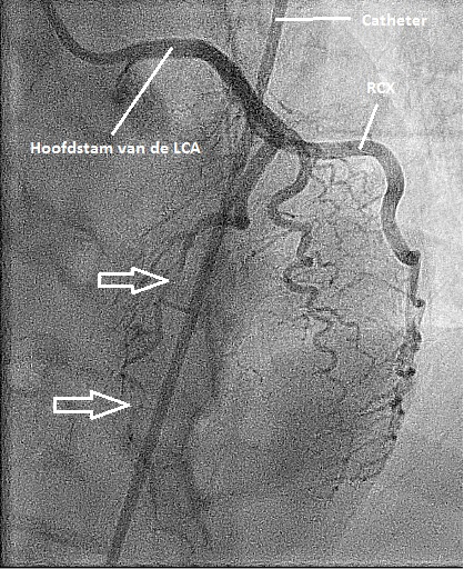 Figuur 2: angiografie beeld van de linkerkransslagader in links laterale 90 graden opname. De witte pijlen geven aan waar het bloedvat (de LAD) is gedisseceerd. LAD = left anterior descending. RCX = ramus circumflexus. LAD en RCX zijn de belangrijke epicardiale vaten. De LAD loopt over de voorwand van het hart en de RCX over de zij-achter wand.
