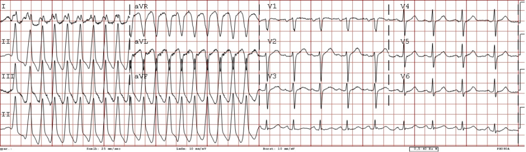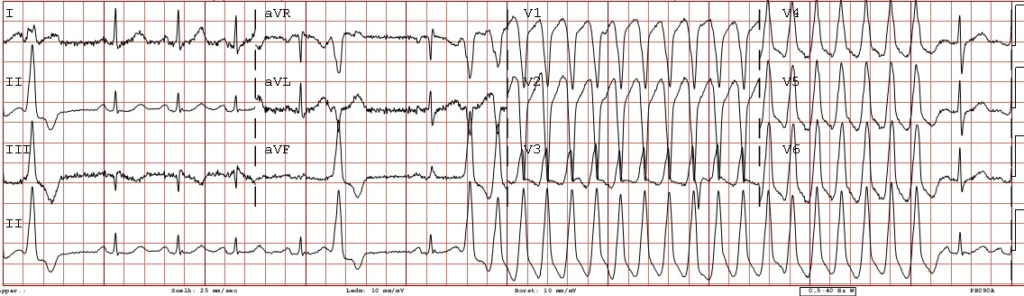 Figuur 1: basisritme sinusritme met “salvo’s” van monomorfe breed QRS-complex tachycardie met een LBTB configuratie (negatief in V1)