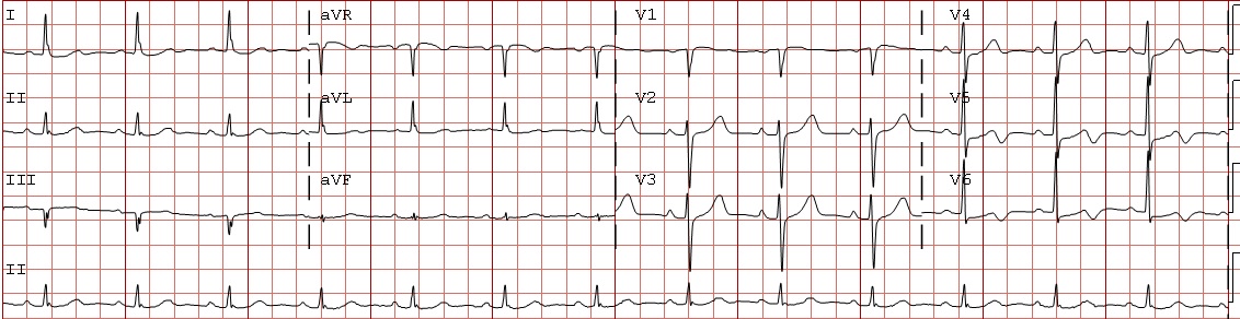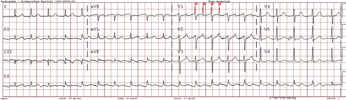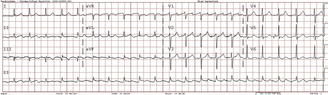 Een 67-jarige man met (opnieuw) hartjagen. Wat ziet u op het elektrocardiogram?