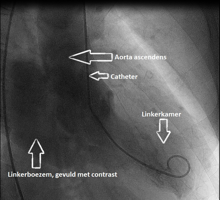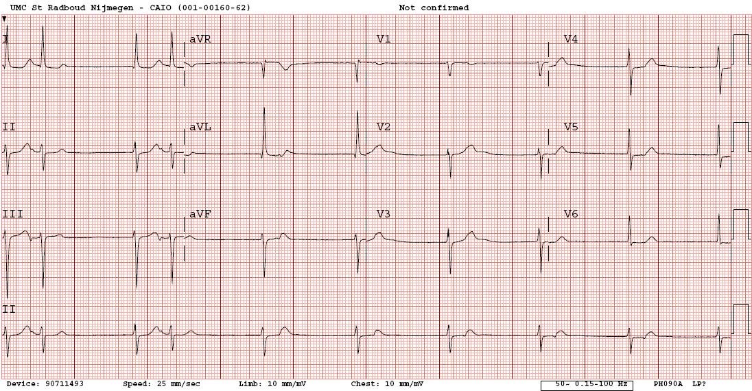 Het ECG laat een bradyaritmie zien: nodaal escape ritme (slank QRS) van 40/min. De stand van de gemiddelde elektrische hartas is naar links gedraaid. Achter het QRS complex (retrograad) ziet men net voor de t-top boezemactivatie. De repolarisatie laat verder geen afwijkingen zien.