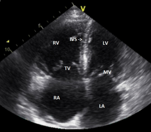 Figuur 1: behorende bij video 1. Transthoracale echocardiografie. Apicale 4-kameropname. RA= rechteratrium. RV= rechterventrikel. IVS= interventriculair septum. LA=linkeratrium. LV=linkerventrikel. TV= tricuspidalisklep. MV=mitralisklep