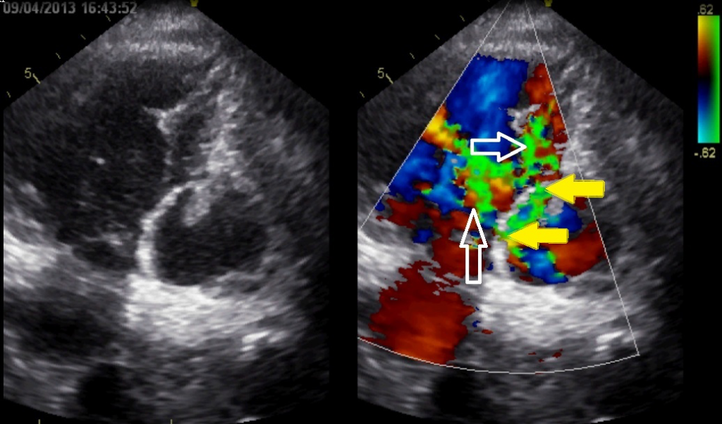 Er is flow te zien (met witte pijlen aangegeven) vanuit de linkerkamer naar de rechterkamer. De gele pijl geeft de plaats van de ruptuur aan.
