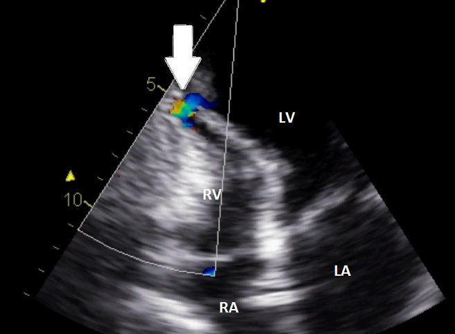 Figuur 3: TTE apicale 4-kamer. De witte pijl geeft de shunt aan en de plaats van de ruptuur.