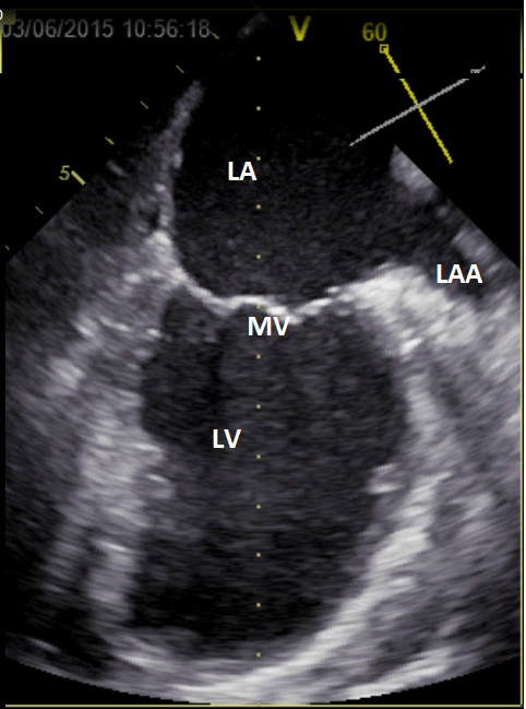 Figuur B – Slokdarmechocardiografie, 2-kamer opname linkerventrikel. LV=linkerventrikel. LA=linkeratrium, MV=mitralisklep, LAA=linker hartoor