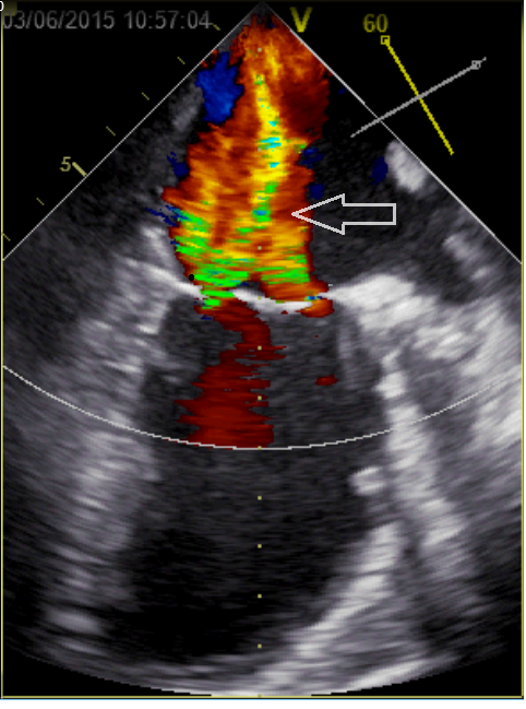 Figuur C – Slokdarmechocardiografie, 2-kamer opname linkerventrikel. De pijl geeft de (ernstige) mitralisklepinsufficiëntie aan.