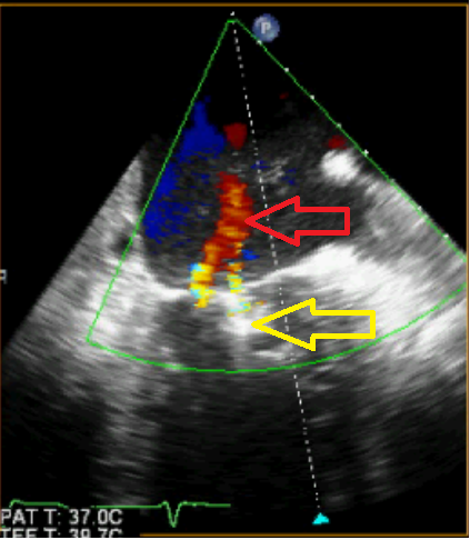 Figuur D –  Slokdarmechocardiografie, 2-kamer opname linkerventrikel. De rode pijl geeft de milde mitralisklepinsufficiëntie aan. Vergeleken met figuur C is er een aanzienlijke reductie van de lekkage. De gele pijl geeft de lokalisatie aan van de MitraClip