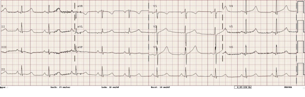Figuur 1 – Elektrocardiogram bij opname : regulair sinusritme, 62/min. Normale stand van de gemiddelde elektrische hartas. PQ-tijd 180 ms, QRS-duur 80 ms, QT-tijd 480 ms en gecorrigeerd (QTc) 471 ms. Het terminaal negatieve in V1 is meer uitgesproken. Opvallend is de morfologie van de T-toppen: er is sprake van een t-top met brede basis.