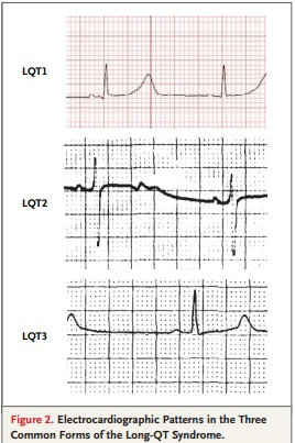 Figuur 2 – ECG kenmerken van de lange QT-tijd subtypen 1 t/m 3. Bron : N Engl J Med 2008